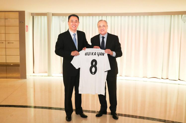 皇馬主席弗洛倫蒂諾向許家印贈(zèng)送特制球衣
