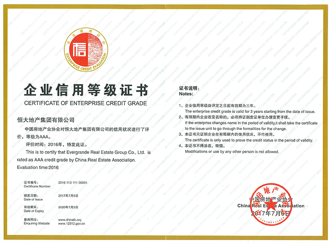 7月11日,中國房地產(chǎn)業(yè)協(xié)會公布了2017年信用等級A級以上的房企榜單,恒大地產(chǎn)集團(tuán)有限公司獲最高等級AAA。