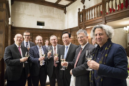 恒大集團(tuán)董事局主席許家印、總裁夏海鈞在歡迎晚宴上與哈佛校長、常務(wù)副校長、設(shè)計學(xué)院院長、免疫疾病中心聯(lián)席院長合影