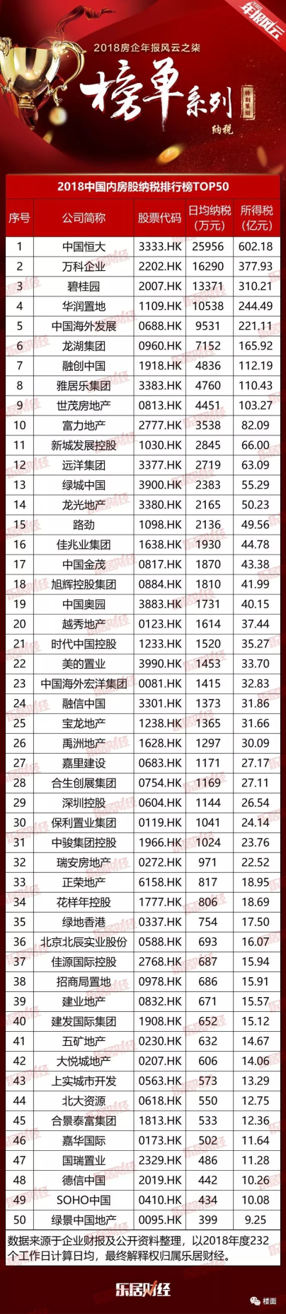 房地產(chǎn)業(yè)一度曾以“高利潤(rùn)”聞名,但其在稅收方面的貢獻(xiàn)不可忽視。近年來(lái),隨著房地產(chǎn)市場(chǎng)進(jìn)入下行周期,但其稅收貢獻(xiàn)仍然很大。4月15日,樂(lè)居財(cái)經(jīng)2018年報(bào)風(fēng)云之榜單系列策劃推出《2018中國(guó)內(nèi)房股所得稅排行榜TOP50》。
